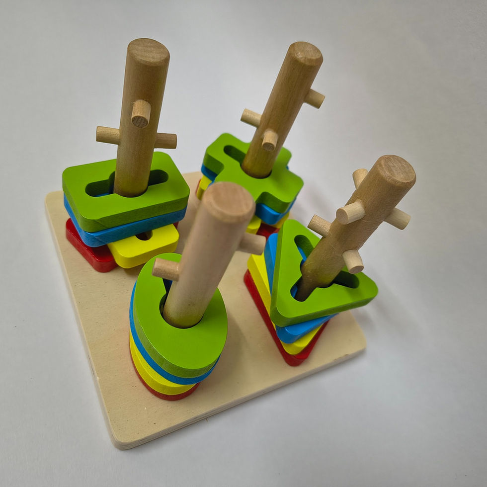 Shape Sorting Toy: This kids toy consists of a wooden board with 4 pillars and 4 pieces of 4 different shapes. Kids can sort and stack the shapes onto the pillars, helping them learn to organize and categorize. They can also create various designs and illustrations with the shape pieces of geometric building blocks for kids, sparking their creativity.